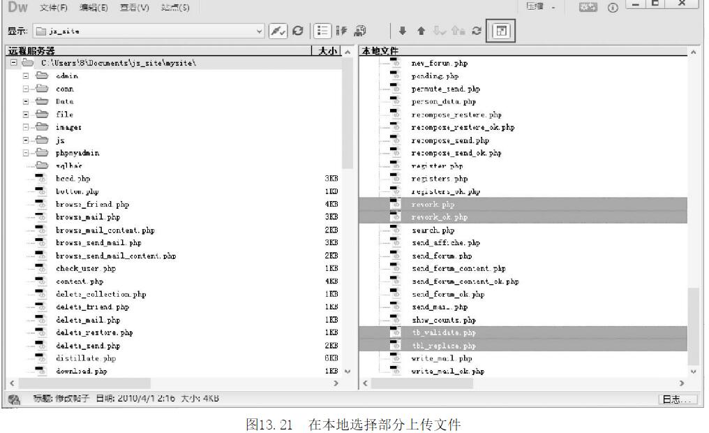 第3步,在工具欄中單擊【展開以顯示本地和遠端站點】按鈕宙,然后在本地站點選中部分文件或者整個站點,如圖13-21所示。