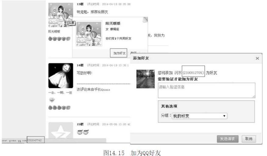 第2步,直接打開大牛QQ空間的日志列表,從他寫的第篇日志開始瀏覽,直到最后篇日志,關注所有日志下面的好友評論,加他們QQ為好友,如圖14-15所示。