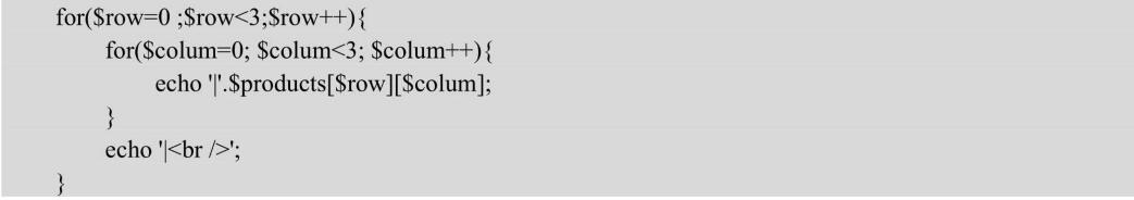 【示例2】要顯示這個數組的內容,可以使用代碼按順序手動訪問每個元素。echo'|'.$products[0][0].'|'.$products[0][1].'|'.$products[0][2].'|<br/>';