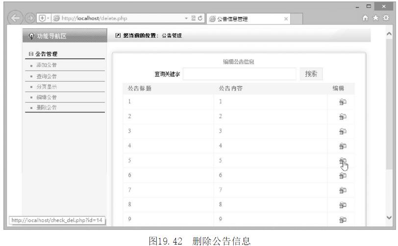 第4步,運(yùn)行示例,在index.php頁(yè)面中單擊刪除公告信息超鏈接導(dǎo)航,打開(kāi)delete.php頁(yè)面,在該頁(yè)面中單擊每一條公共信息后的刪除圖標(biāo),就會(huì)彈出一個(gè)提示對(duì)話(huà)框,單擊【確定】按鈕,完成對(duì)指定的公告信息刪除操作,如圖19.42所示。