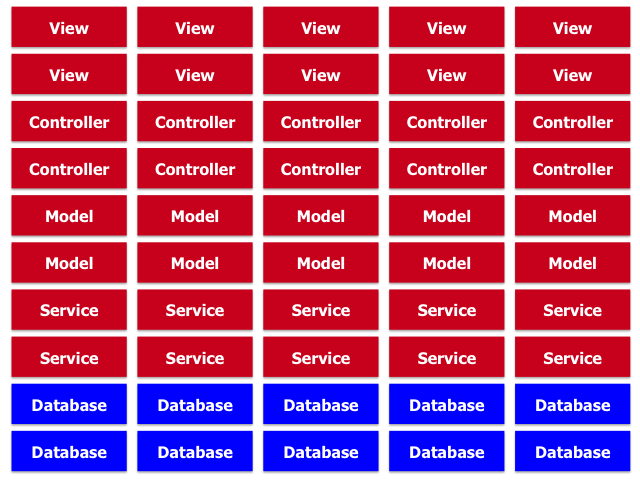 滿足這個(gè)條件的架構(gòu)在初期是非常令人愉悅的。上一部分我們描述的框架都符合這種架構(gòu)。這個(gè)階段開(kāi)發(fā)非??欤?/span>IDE打開(kāi)很快,開(kāi)發(fā)功能完成很快,團(tuán)隊(duì)這個(gè)時(shí)候往往規(guī)模較小,交流也沒(méi)有問(wèn)題。所有人都很高興——因?yàn)橛昧诵录夹g(shù),因?yàn)檫@個(gè)架構(gòu)是如此的簡(jiǎn)單、清晰、有效。