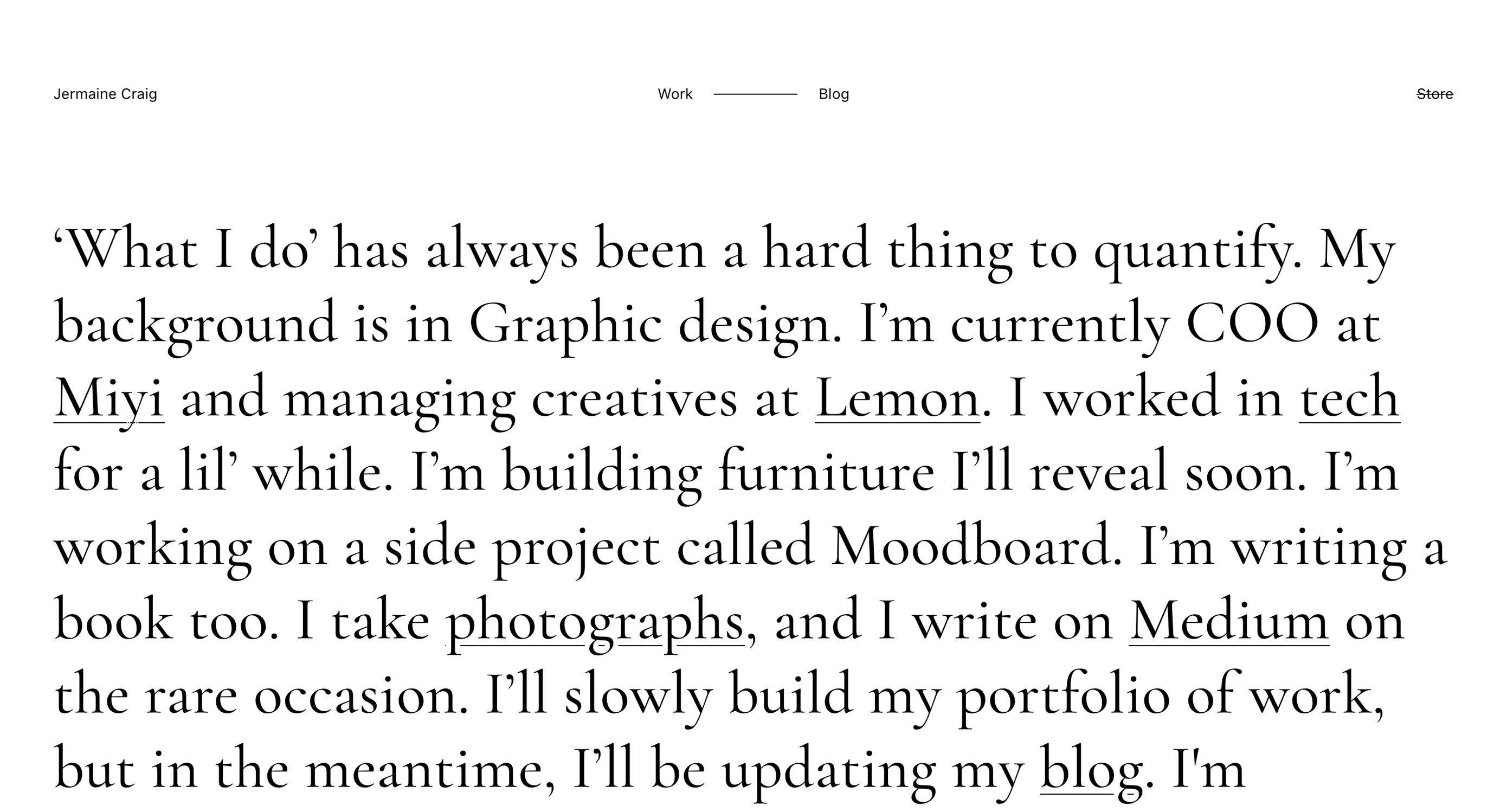 Jermaine Craig 的作品集網(wǎng)站采用了一種風(fēng)險較大的首屏設(shè)計:將一大段文字擺在訪客面前。這種反模式的設(shè)計有的時候還是蠻有用的。