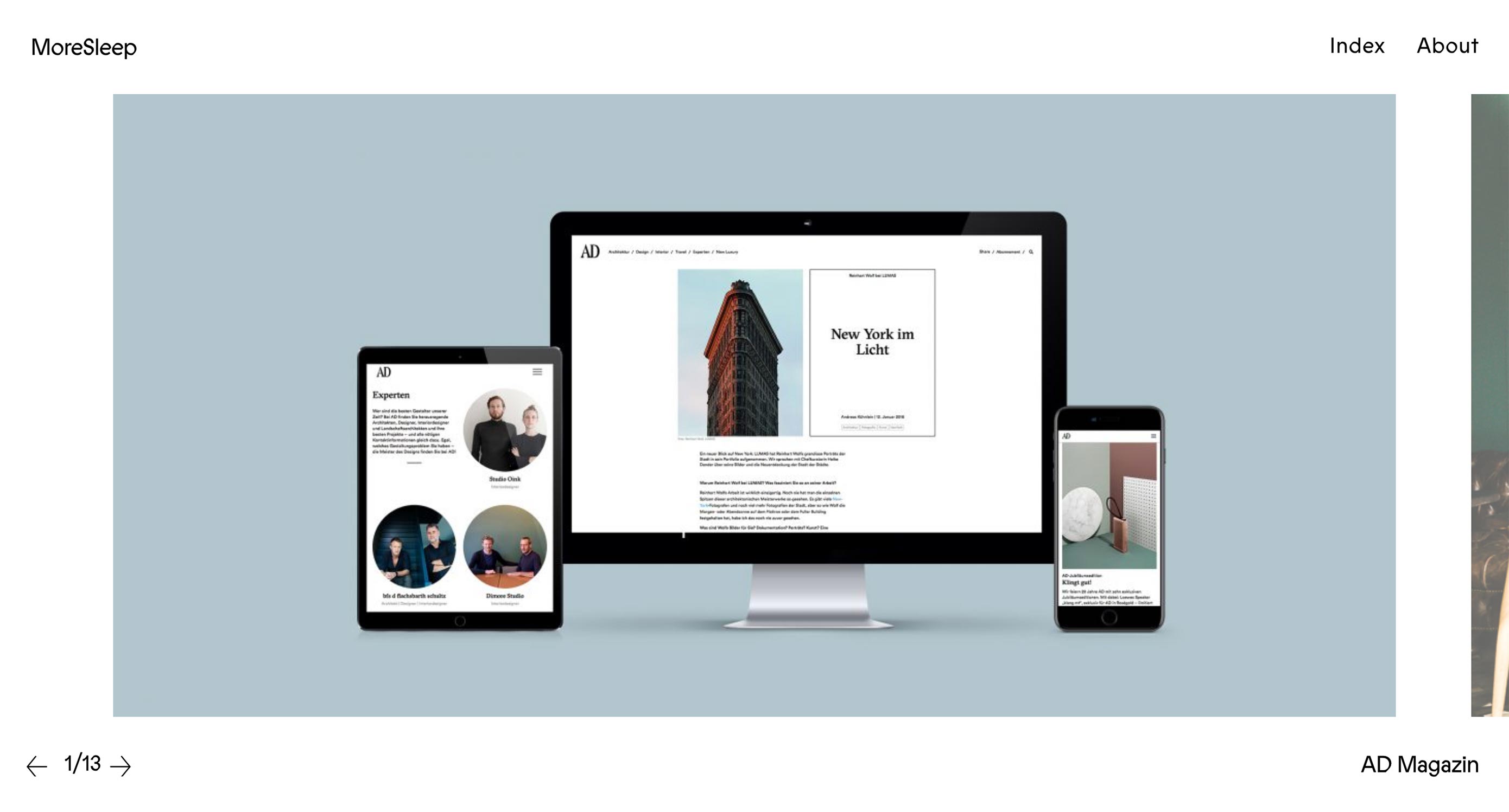 Less+More 采用了典型的“大留白+加粗標(biāo)題字體”的設(shè)計,此外,設(shè)計師采用的圖片素材也同樣大氣無比,搭配上微妙的動效,整個設(shè)計顯得頗為耐看。