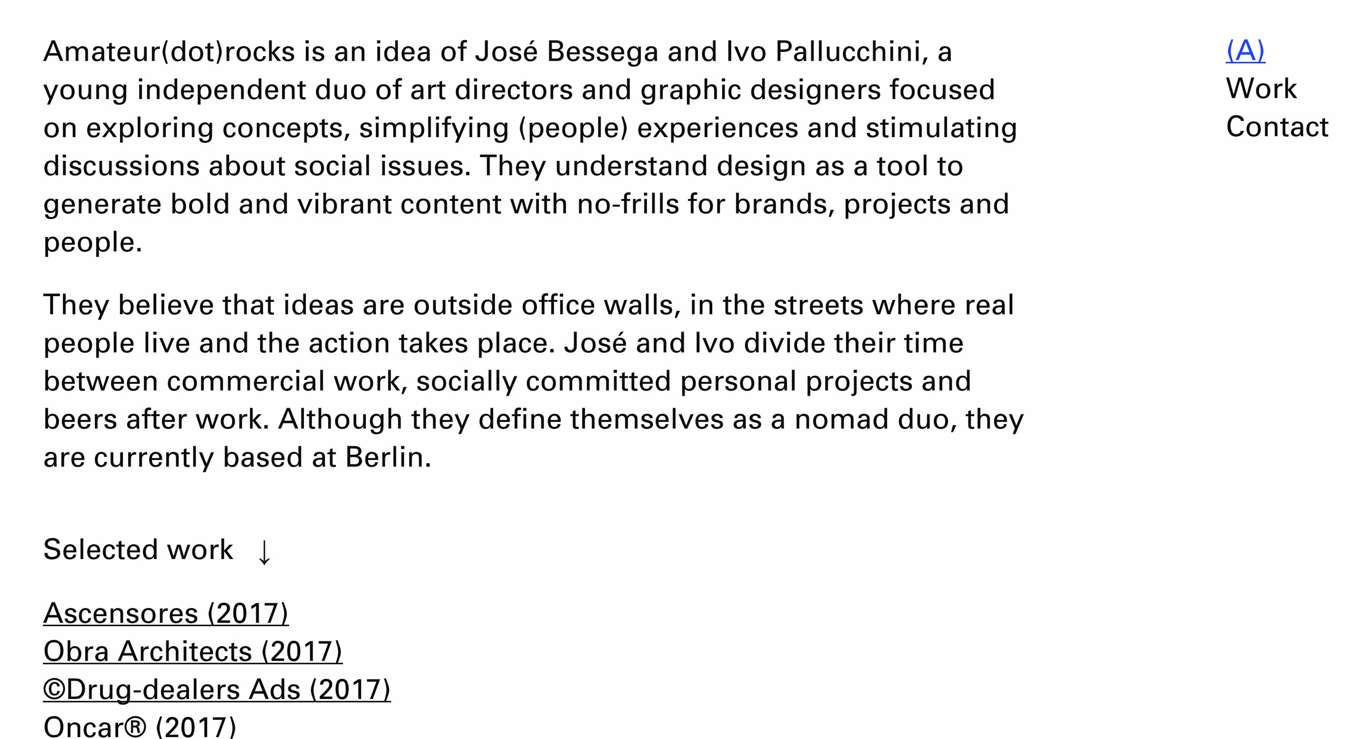 Amateur.rocks 這個作品集網(wǎng)站當(dāng)中,看起來都是文本,實際上當(dāng)你將光標(biāo)移動到特定的項目鏈接上的時候,就能夠預(yù)覽作品,點擊可進入。