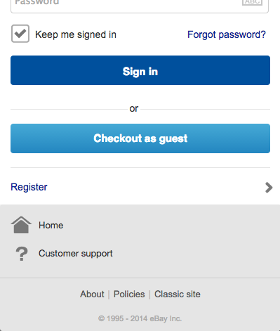 根據(jù) Maymard 的研究,強迫用戶注冊賬戶是人們放棄狗屋的最主要原因。應(yīng)當允許用戶發(fā)生購買而無需注冊,在購買頁面應(yīng)該有“作為訪客結(jié)帳”的選項,并且要明顯。ebay 的購買頁面當中,就提供了“登錄”和“作為訪客結(jié)帳”的選項。