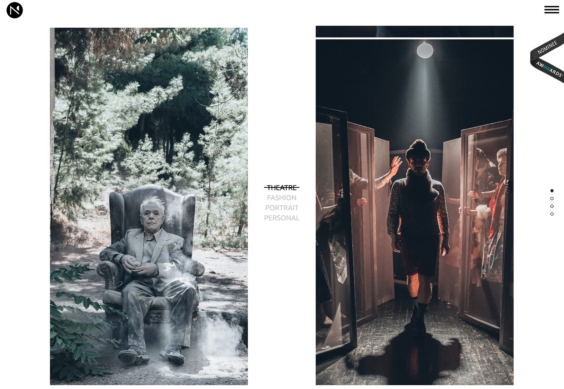 Nikos Pandazaras 的作品集網(wǎng)站則選擇了截然不同的設(shè)計思路。他將導航置于屏幕的中間,而攝影作品則左右各一并排放置,兩者的重要性無疑是對等的,用戶可以同時看到兩幅不同的作品,屏幕的利用率倒是挺高的。