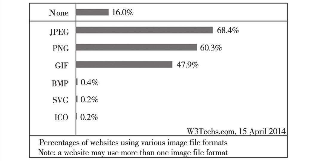(2)矢量圖形,也稱為面向?qū)ο蟮膱D像或繪圖圖像,在數(shù)學(xué)上定義為一系列由線連接的點(diǎn)。矢量文件中的圖形元素稱為對(duì)象。每個(gè)對(duì)象都是一個(gè)自成一體的實(shí)體,都具有顏色、形狀、輪廓、大小和屏幕位置等屬性。矢量圖形是根據(jù)幾何特性繪制的圖形,只能靠軟件生成。它的優(yōu)點(diǎn)是文件占用空間小、圖像元素對(duì)象可編輯、不受分辨率和輸出設(shè)備影響,放大后矢量圖形不會(huì)失真。它最大的缺點(diǎn)是難以表現(xiàn)色彩層次豐富的逼真圖像效果。矢量圖形適用于圖形設(shè)計(jì)、文字設(shè)計(jì)和一些標(biāo)志設(shè)計(jì)、版式設(shè)計(jì)等。常見的矢量圖形格式有SWF、SVG、AI、CDR和DWG等。矢量圖形常用的繪畫工具主要包括Adobe公司的Illustrator和Flash、Corel公司的CorelDraw等。根據(jù)某網(wǎng)站的統(tǒng)計(jì)顯示,Web頁(yè)面中的圖形圖像格式所占百分比如圖4-33所示,從中可以看出網(wǎng)站中大量采用了JPEG的圖像格式,這種方式可以為服裝企業(yè)網(wǎng)站的建設(shè)提供一些借鑒。