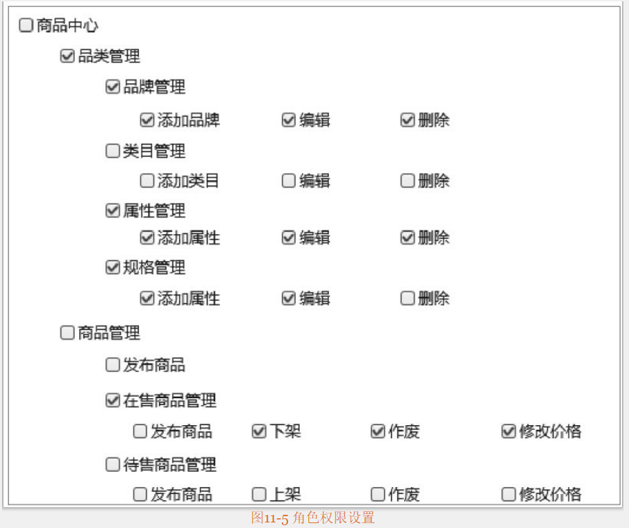 如圖11-5所示,勾選相應(yīng)的功能選項(xiàng),相應(yīng)的角色就有類似的權(quán)限。怎么做到權(quán)限列表與實(shí)際功能一一對(duì)應(yīng)?就需要在開(kāi)發(fā)系統(tǒng)頁(yè)面時(shí),將統(tǒng)一的權(quán)限接口嵌入到頁(yè)面中。系統(tǒng)在初始化時(shí)會(huì)賦予某些用戶管理員角色,管理員有著系統(tǒng)所有模塊的功能操作權(quán)限。管理員通過(guò)創(chuàng)建不同的用戶角色,給不同角色授予不同功能權(quán)限。想批量修改用戶權(quán)限時(shí),只需要修改角色權(quán)限就行。有時(shí)當(dāng)后臺(tái)功能復(fù)雜、部門(mén)崗位較多時(shí),由于每個(gè)人分工不同,就需要分配不同的權(quán)限,角色數(shù)量就會(huì)增加。為了方便管理,會(huì)對(duì)角色進(jìn)行分組。角色分組一般是與部門(mén)進(jìn)行綁定。例如運(yùn)營(yíng)部下有活動(dòng)運(yùn)營(yíng)、商品管理、專場(chǎng)運(yùn)營(yíng)、類目運(yùn)營(yíng)等角色,其他部門(mén)都不能使用這些角色。
