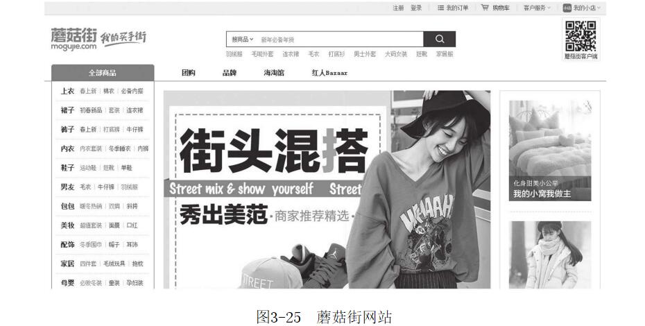 圖3-25 蘑菇街網(wǎng)站C2C服裝電子商務(wù)的主要盈利模式有會員費、交易提成、廣告費、搜索競價排名和支付環(huán)節(jié)收費等。C2C網(wǎng)站為會員提供網(wǎng)上店鋪出租,公司認(rèn)證,產(chǎn)品信息推薦等多種服務(wù)組合而收取費用,這種盈利模式的收益比較穩(wěn)定。交易提成也是C2C網(wǎng)站的主要利潤來源。C2C網(wǎng)站提供一個交易平臺,為交易雙方提供機會,從交易中收取提成來進行盈利。企業(yè)將網(wǎng)站上有價值的位置用于放置各類型廣告,根據(jù)網(wǎng)站流量和網(wǎng)站人群精度標(biāo)定廣告位價格,然后再通過各種形式向客戶出售。C2C網(wǎng)站商品的豐富性決定了購買者搜索行為的頻繁性,網(wǎng)站用戶可以為某關(guān)鍵字提出自己認(rèn)為合適的價格,最終由出價最高者競得,在有效時間內(nèi)該用戶的商品可獲得競得的排位。支付寶業(yè)務(wù)在一定程度上促進了網(wǎng)上在線支付業(yè)務(wù)的開展,通過中間支付服務(wù)商,保證了交易雙方的支付安全,支付公司按成交額的一定比例收取手續(xù)費。此類支付平臺也越來越多。