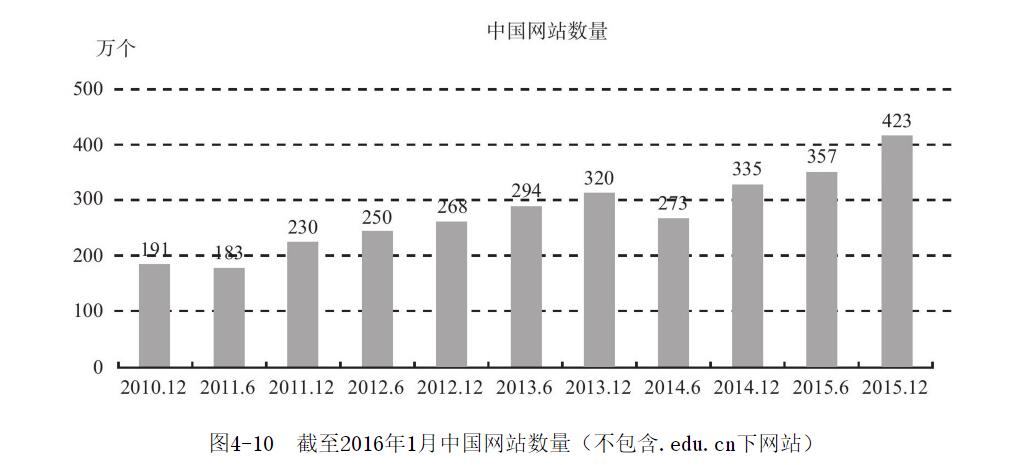 根據(jù)中國互聯(lián)網(wǎng)信息中心(CNNIC)2016年1月發(fā)布的《第37次中國互聯(lián)網(wǎng)絡(luò)發(fā)展?fàn)顩r統(tǒng)計報告》,截至2015年12月,中國網(wǎng)站總數(shù)為423萬個,如圖4-10所示。