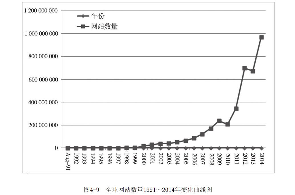 圖4-9 全球網(wǎng)站數(shù)量1991~2014年變化曲線圖資料來源:http://www.internetlivestats.com/total-number-of-websites/和本書作者根據(jù)網(wǎng)站提供數(shù)據(jù)繪制