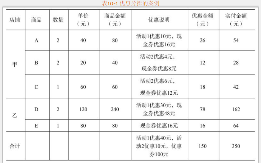 訂單中有甲、乙兩店的商品A、B、C、D、E,包郵。商品A、D參加跨店滿200減40的活動(dòng)(活動(dòng)1),商品B、C參加滿100減10的活動(dòng)(活動(dòng)2),另外用戶還使用了100元的現(xiàn)金券。如表10-1所示,訂單總共優(yōu)惠150元,其中活動(dòng)1優(yōu)惠40元,活動(dòng)2優(yōu)惠10元,優(yōu)惠券100元。并不是將優(yōu)惠完全平均分?jǐn)傊撩總€(gè)商品上,而是按照優(yōu)惠分?jǐn)傇瓌t,比如活動(dòng)1在商品A、D的優(yōu)惠金額分別是40x(80/320)=10元、40×(240/320)=30元,其他優(yōu)惠金額詳見表中。