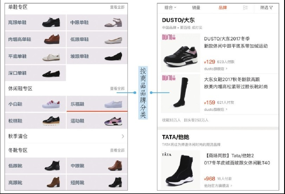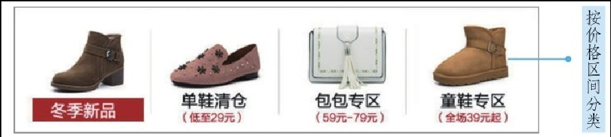 除了上述三種分類方法外,還有按價格區(qū)間分類等分類方法。在實(shí)際應(yīng)用中,大多是多種分類方法搭配使用的,以便消費(fèi)者從不同的角度篩選商品。例如,先將商品按品牌(如韓都衣舍、茵曼)分成幾大類,每個品牌下再按商品自有屬性(如毛衣、長裙)分成小類。新手賣家可以參考一些規(guī)模較大的店鋪的商品分類,當(dāng)然也可以請專業(yè)的數(shù)據(jù)分析人士來幫助進(jìn)行商品分類。新店剛起步時通常規(guī)模較小,分類只要不是過于混亂,都是可以被消費(fèi)者接受的,各種分類方法的效果也不會有太大的不同,如圖5-24所示。