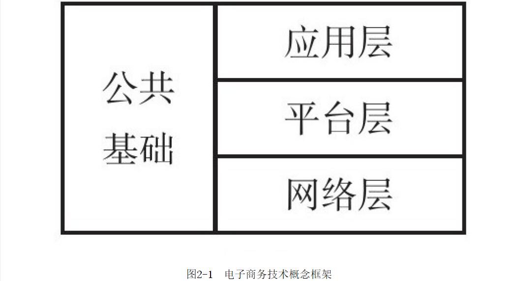 通常電子商務(wù)技術(shù)概念框架如圖2-1所示,該框架通過(guò)層次化的結(jié)構(gòu)描述了電子商務(wù)實(shí)現(xiàn)技術(shù)與其相互關(guān)系。其中網(wǎng)絡(luò)層為電子商務(wù)提供了必要的網(wǎng)絡(luò)環(huán)境,平臺(tái)層向電子商務(wù)提供了必要的應(yīng)用技術(shù)手段,應(yīng)用層是滿足電子商務(wù)的各種應(yīng)用領(lǐng)域,公共基礎(chǔ)部分始終貫穿在這三個(gè)層次中,并對(duì)電子商務(wù)的推廣、普及和應(yīng)用起著重要的作用,是創(chuàng)造電子商務(wù)具體應(yīng)用的基礎(chǔ)。目前的電子商務(wù)基本都是在這個(gè)架構(gòu)上不斷發(fā)展的。