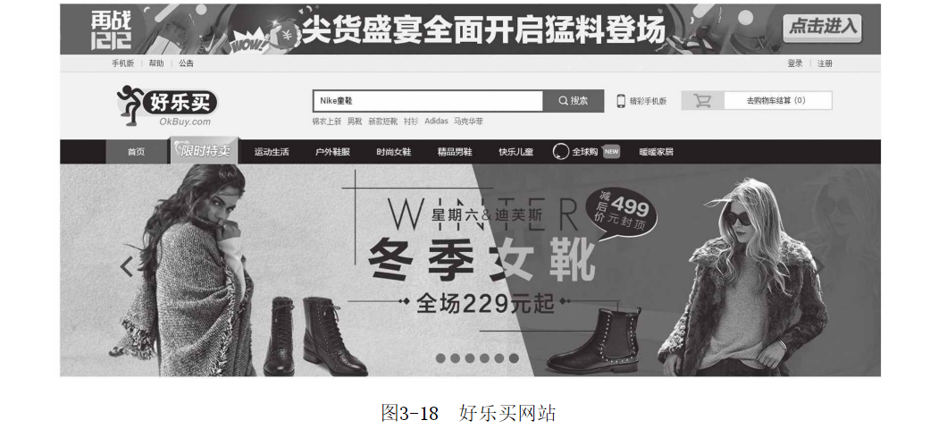 圖3-17 唯品會網(wǎng)站好樂買OkBuy成立于2007年8月,通過將現(xiàn)代電子商務(wù)模式與傳統(tǒng)零售業(yè)進行創(chuàng)新性融合,以現(xiàn)代化網(wǎng)絡(luò)平臺和呼叫中心為服務(wù)核心,以先進的直銷營銷理念配合高效完善的配送系統(tǒng),成功實現(xiàn)了無中間商、無店鋪租金的經(jīng)營模式,真正做到物美價廉,快捷便利地為消費者提供高品質(zhì)、折扣價的正品鞋子與時尚服裝。