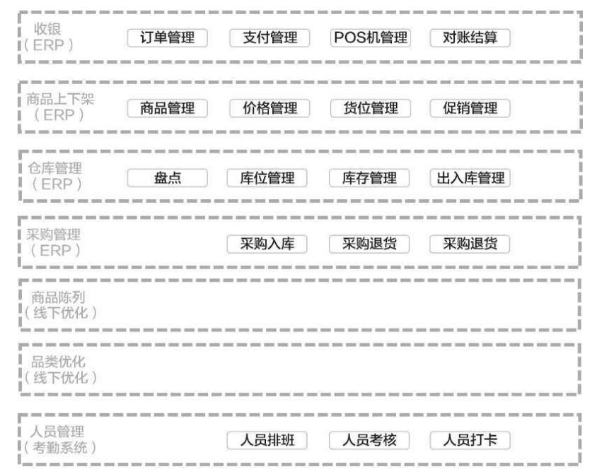 如圖7-6所示。倉庫環(huán)節(jié)需要搭建倉庫的庫區(qū)庫位管理,雖然無法像大倉一樣復雜,但基本的入庫、出庫、揀貨和盤點等是需要具備的。需要對庫存進行監(jiān)控預警管理,確保庫存的可售。前店商品的陳列也需要進一步對客流購買的情況進行數據沉淀,確定店鋪內的熱力區(qū),即銷售情況,適時調整陳列,提高商品收益。銷售方面,店鋪內的流量受地域、選址等因素限制,往往會穩(wěn)定在一定的區(qū)間內,我們需要將店鋪內的坪效進一步擴大。這時候引入新的銷售渠道就是不錯的方法,線上流量的導入可以有效地提升人員的坪效和收益。為此需要提供線上的一套平臺服務和系統(tǒng),它們包括電商的一些基本功能模塊,如訂單、促銷、會員、優(yōu)惠券和用戶端等。履約方面,由于便利店的服務范圍有限,因此服務區(qū)域也同O2O小程序類似,配送履約的方式按照用戶的簽收方式分為到店和到家兩種模式。到家模式可以按照O2O小程序的方式進行履約生產,線上下單支付后,店內進行接單并針對商品進行分揀,等待第三方配送人員到達后交貨進行履約。到店模式則簡單許多,用戶下單后可以到店支付并完成自提的過程,這樣進一步為店內消費場景增加了流量和購買機會。
