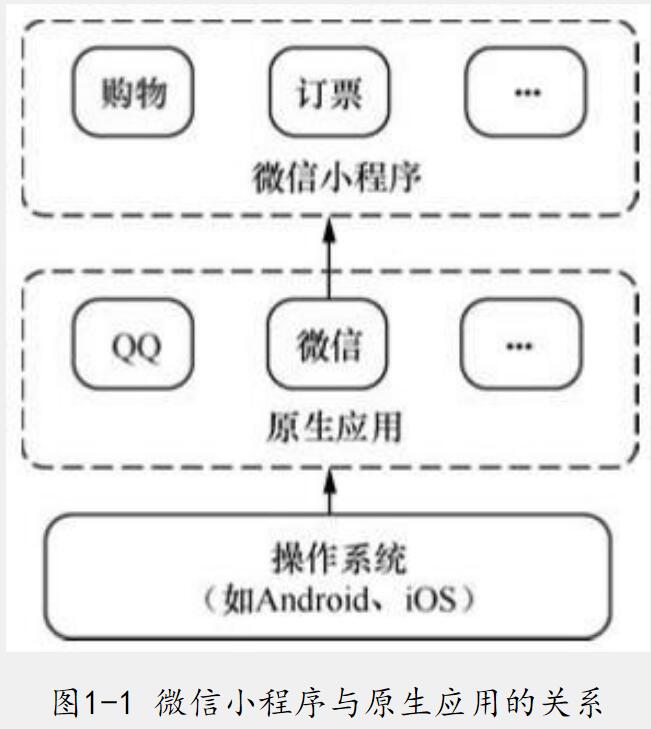 微信小程序是一種不需要安裝即可使用的應(yīng)用,用戶只要“掃一掃”或“搜一搜”即可打開應(yīng)用,無須安裝或卸載。微信小程序運行于微信之上,它的交互類似于手機原生應(yīng)用,但是每個應(yīng)用的體積非常小(目前上限是2048KB),具有無須安裝、觸手可及、用完即走、無須卸載的特點。微信小程序與原生應(yīng)用的關(guān)系如圖1-1所示。