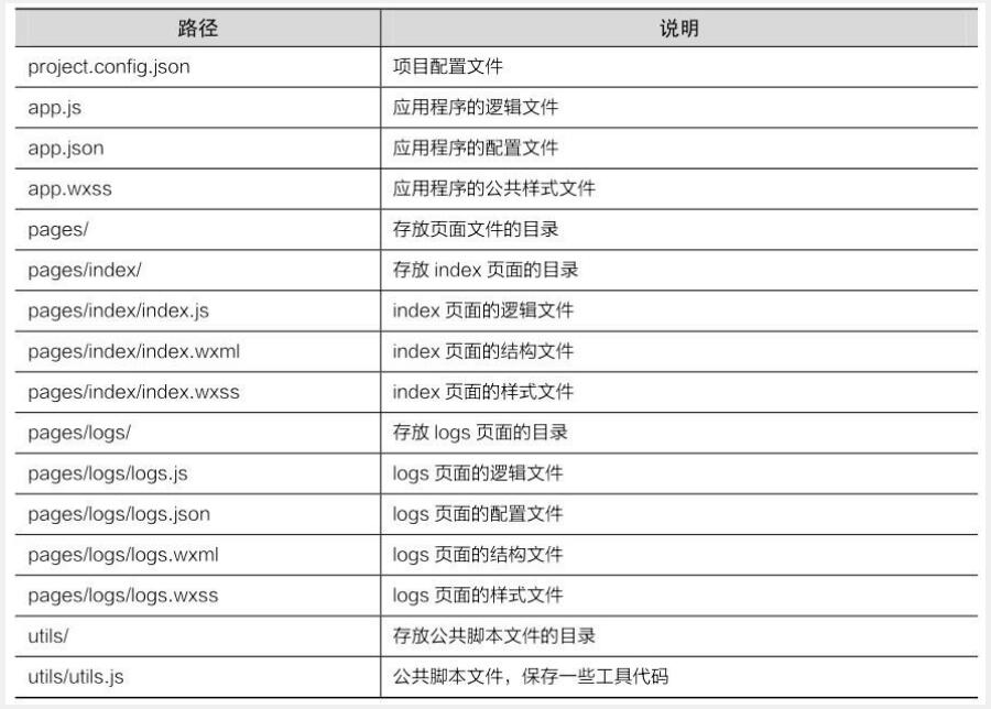 Hello World小程序的目錄結(jié)構(gòu)如表1-4所示。