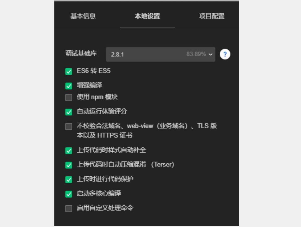 接下來,我們可以對開發(fā)者工具做一些設(shè)置。打開右上角的“詳情”即可根據(jù)需要做一些編譯相關(guān)的配置修改。例如,本地設(shè)置如圖2-6所示。