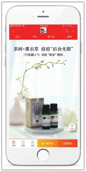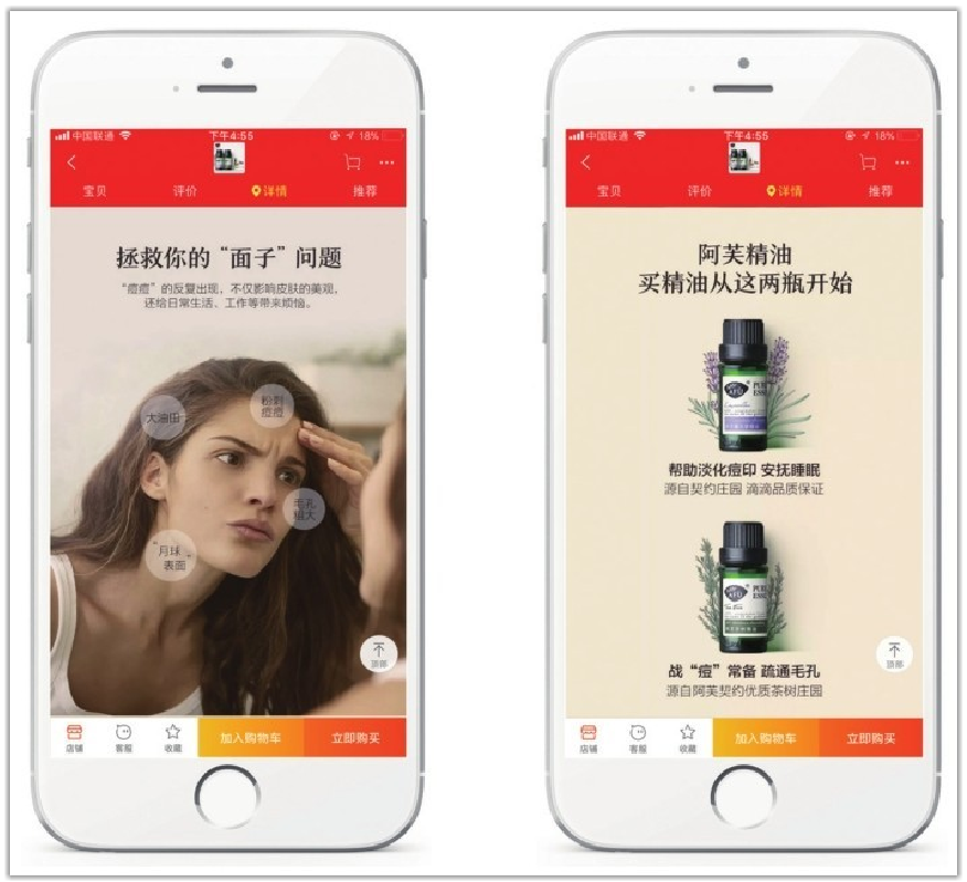 根據(jù)商品的特征和賣(mài)點(diǎn),制作賣(mài)點(diǎn)系列廣告圖,如圖7-16所示。對(duì)于該精油的功能、可以達(dá)到哪些功效等賣(mài)點(diǎn)擴(kuò)展放大為可以看得見(jiàn)的東西,給消費(fèi)者以實(shí)在的誘惑和美好的聯(lián)想,就好像已經(jīng)看到了用了這個(gè)商品之后沒(méi)有痘痘的生活。如此具有誘惑力的賣(mài)點(diǎn)圖會(huì)讓消費(fèi)者流連忘返,很容易達(dá)成了成交意向。在制作詳情頁(yè)時(shí),最核心的亮點(diǎn)就是商品的賣(mài)點(diǎn)。用有效的形式讓消費(fèi)者更懂得商品的優(yōu)勢(shì),用最直觀的方法將賣(mài)點(diǎn)變?yōu)橄M(fèi)者的利益點(diǎn),這就是在設(shè)計(jì)詳情頁(yè)時(shí)所需要重點(diǎn)體現(xiàn)的內(nèi)容。