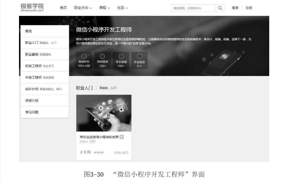 圖3-29 極客學(xué)院官網(wǎng)首頁點擊“微信小程序開發(fā)工程師”選項之后,頁面將跳轉(zhuǎn)至如圖3-30所示的“微信小程序開發(fā)工程師”界面。在該界面中,提供“職業(yè)入門”“職業(yè)基礎(chǔ)”“初級工程師”“中級工程師”和“成長計劃”這5類課程,用戶只需根據(jù)自身需求進行選擇即可。