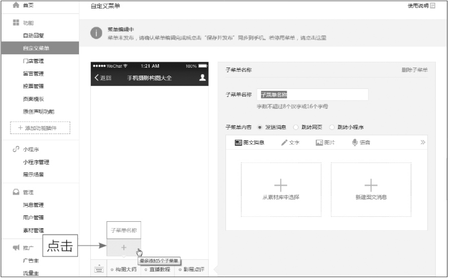 公眾號菜單欄可跳轉(zhuǎn)小程序功能,相當(dāng)于增加了從公眾號進(jìn)入小程序的一條途徑。運營者只需進(jìn)行如下操作便可實現(xiàn)公眾號菜單欄跳轉(zhuǎn)至小程序。步驟1進(jìn)入微信公眾號后臺,在“自定義菜單”界面點擊圖標(biāo),操作完成后,頁面中將出現(xiàn)子菜單欄的相關(guān)設(shè)置,如圖4-2所示。