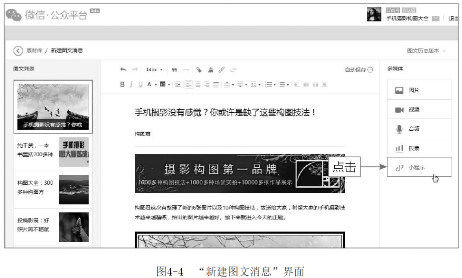 2017年3月27日小程序開放的6大新功能中,出現(xiàn)了一個高頻詞匯,那就是“公眾號”。因此,此次開放新功能也被外界視為微信打通小程序和公眾號的重要嘗試。和公眾號菜單欄可跳轉(zhuǎn)小程序相同,公眾號圖文消息可打開小程序?qū)嶋H上也增加了進(jìn)入小程序的途徑。運營者只需進(jìn)行如下操作便可實現(xiàn)讓用戶在公眾號模板消息中打開小程序。步驟1進(jìn)入微信公眾平臺的“新建圖文消息”界面,并點擊右側(cè)的“”按鈕,如圖4-4所示。