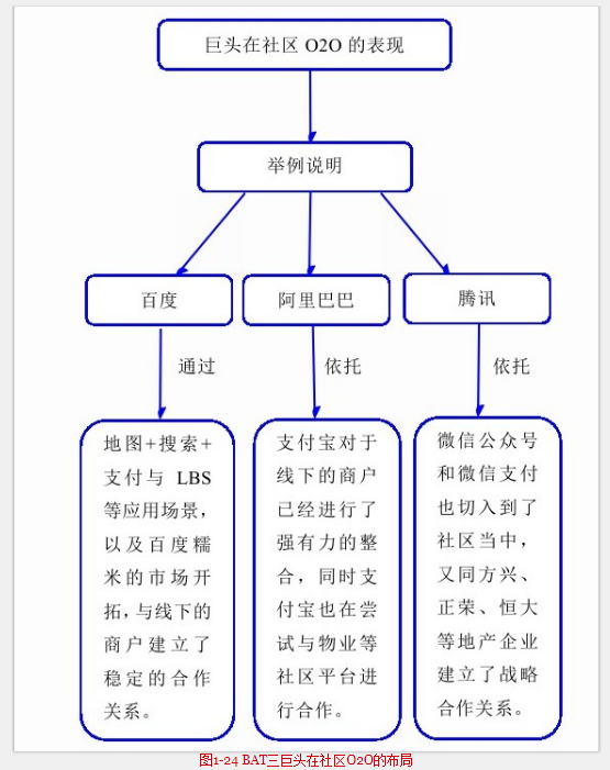 社區(qū)O2O小程序主要的參與者是物業(yè)和創(chuàng)業(yè)者。但巨頭們也很看好社區(qū)這塊市場(chǎng),社區(qū)的流量入口和線下資源的商業(yè)價(jià)值是巨大的,而巨頭們從市場(chǎng)的地位而言,是具有優(yōu)勢(shì)的,如圖1-24所示。