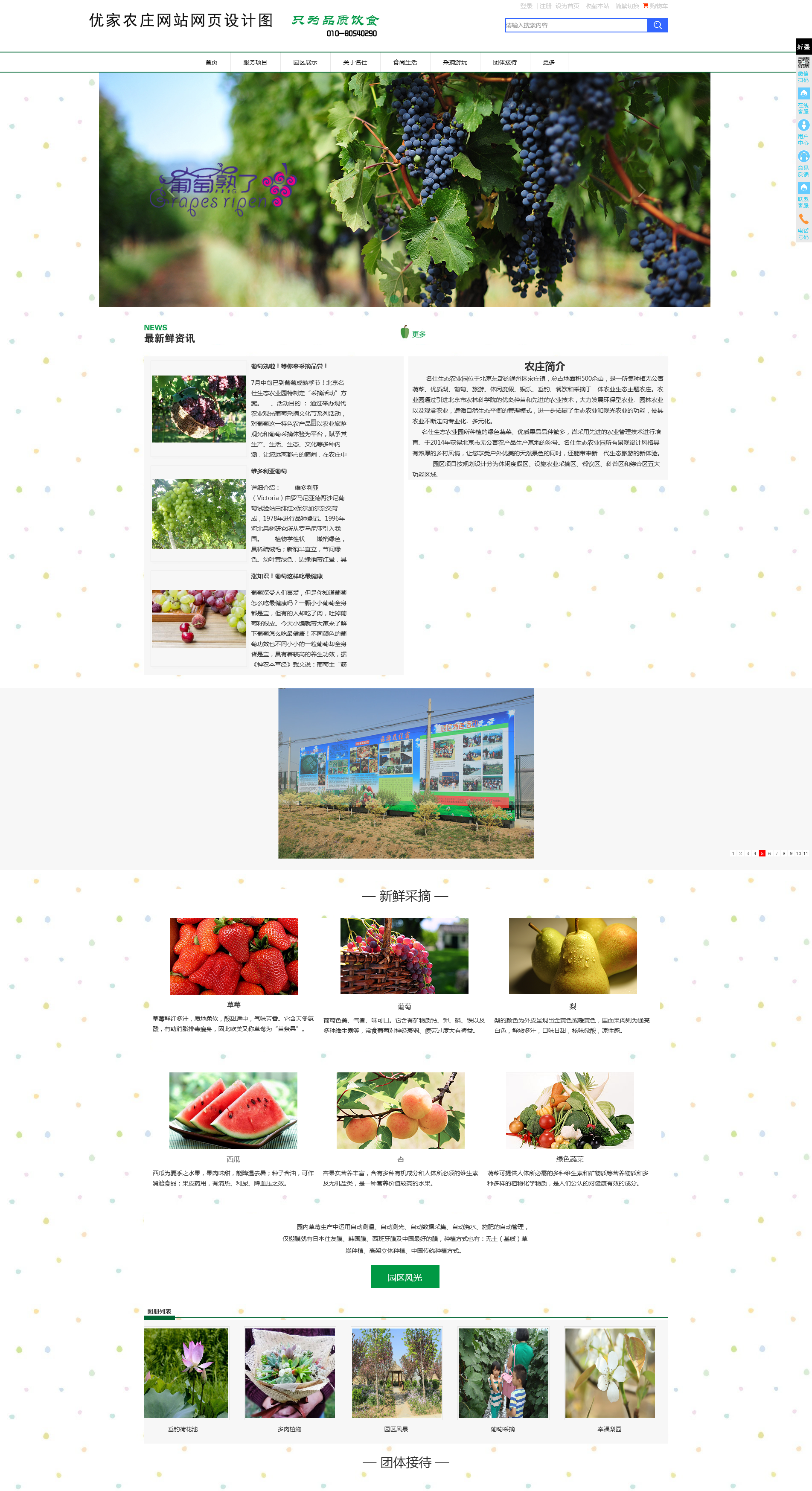 網(wǎng)頁設(shè)計:優(yōu)家農(nóng)莊所種植的綠色蔬菜、優(yōu)質(zhì)果品品種繁多,皆采用先進(jìn)的農(nóng)業(yè)管理技術(shù)進(jìn)行培育。于2014年獲得北京市無公害農(nóng)產(chǎn)品生產(chǎn)基地的稱號。名仕生態(tài)農(nóng)業(yè)園所有景觀設(shè)計風(fēng)格具有濃厚的鄉(xiāng)村風(fēng)情,讓您享受戶外優(yōu)美的天然景色的同時,還能帶來新一代生態(tài)旅游的新體驗