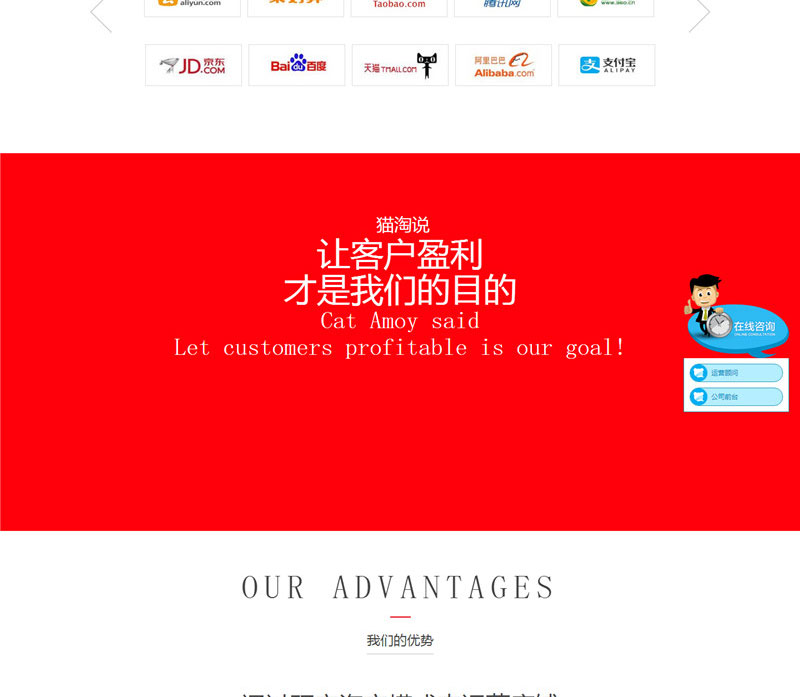 貓?zhí)噪娚讨饕獜氖碌谌诫娮由虅?wù)服務(wù),業(yè)涉及范圍:淘寶天貓整店運(yùn)營、店鋪營銷策劃、直通車引流打造爆款、鉆展、 無線端運(yùn)營、淘寶客、店鋪裝修等一站式服務(wù) 。公司始終堅持專業(yè)、用心、執(zhí)著的服務(wù)理念,數(shù)年來成功運(yùn)營淘寶商家達(dá)3000余家,服務(wù)客戶遍及全國各地,為顧客創(chuàng)造利潤收入達(dá)數(shù)千萬元,實現(xiàn)了商家的淘寶創(chuàng)業(yè)夢想,服務(wù)技術(shù)受到客戶的一致好評。