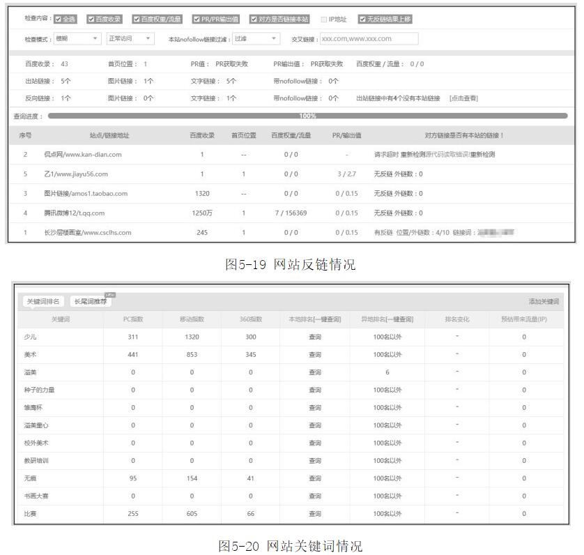 圖5-19所示為網(wǎng)站反鏈情況,圖5-20所示為網(wǎng)站關(guān)鍵詞情況。[聲明]本網(wǎng)轉(zhuǎn)載網(wǎng)絡(luò)媒體稿件是為了傳播更多的信息,此類稿件不代表本網(wǎng)觀點(diǎn),本網(wǎng)不承擔(dān)此類稿件侵權(quán)行為的連帶責(zé)任。故此,如果您發(fā)現(xiàn)本網(wǎng)站的內(nèi)容侵犯了您的版權(quán),請您的相關(guān)內(nèi)容發(fā)至此郵箱【qin@198bona.com 】,我們在確認(rèn)后,會立即刪除,保證您的版權(quán)。