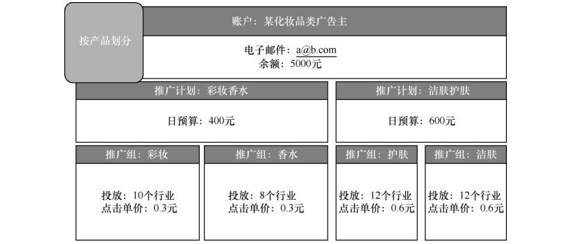 1.按照產品搭建賬戶該策略以企業(yè)的產品種類為單位,設置不同的推廣計劃,根據企業(yè)營銷目標設定主推產品和每日推廣的預算費用。按照產品的具體型號或樣式詳細劃分每個推廣計劃下面的推廣組,設置定向投放模式和出價。這里以某化妝品企業(yè)為例,推廣人員可以將賬戶推廣計劃劃分為彩妝香水類計劃和潔膚護膚類計劃,將潔膚護膚品作為主推產品,每日推廣預算費用設置得要比彩妝香水類計劃高一些。然后在該計劃下按照潔膚和護膚劃分推廣組,井設定投放模式和出價價格。圖12-15所示為該化妝品企業(yè)網盟賬戶結構。