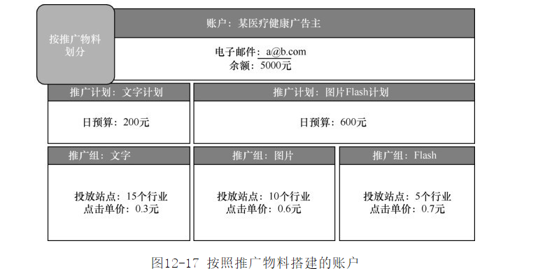 3.按照推廣物料搭建賬戶網盟的推廣物料即網盟廣告創(chuàng)意展現的形式,主要有文字、圖片及動畫。因此,推廣人員還可以按照推廣的物料搭建網盟賬戶結構。這里以某醫(yī)療健康網為例,推廣計劃按照文字和圖片進行劃分,推廣組按照文字、圖片、動畫進行設置。圖12-17所示為該醫(yī)療健康網站的網盟賬戶結構。