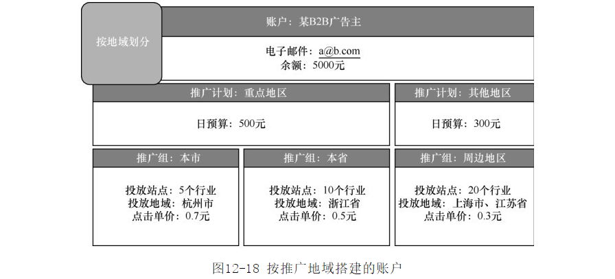 4.按照推廣地域搭建賬戶最后,還可以根據推廣地域搭建賬戶,按照企業(yè)廣告投放的主要目標市場將推廣計劃分為重點推廣地區(qū)和其他推廣地區(qū)。推廣組細分為本市、本省及周邊地區(qū)。例如某B2B網站的網盟賬戶搭建策略,如圖12-18所示。