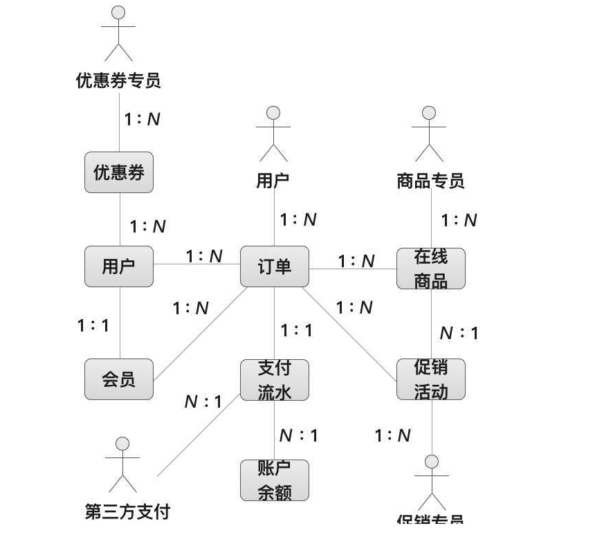 由于增加了促銷系統(tǒng)和優(yōu)惠券系統(tǒng),在運營角色上需要增加促銷專員、優(yōu)惠券專員,不過目前階段兩個職位合并在一起也是可以的。每個專員發(fā)送多個批次的優(yōu)惠券給用戶,優(yōu)惠券以一對一的形式放入用戶的賬戶中。用戶下單時可以根據(jù)擁有的優(yōu)惠券選擇使用。促銷活動也是如此,每個促銷專員管理多個促銷活動,同一個促銷活動中可以允許出現(xiàn)多個商品。用戶在下單時,訂單根據(jù)商品確定支持參加哪些促銷,同一個訂單允許同時多個促銷生效。E-R圖如圖3-30所示。