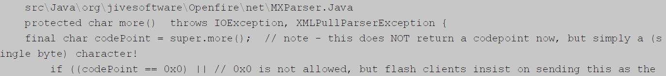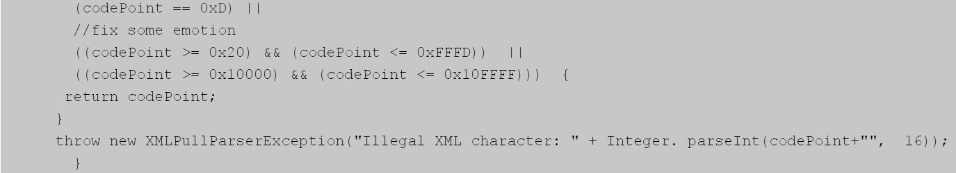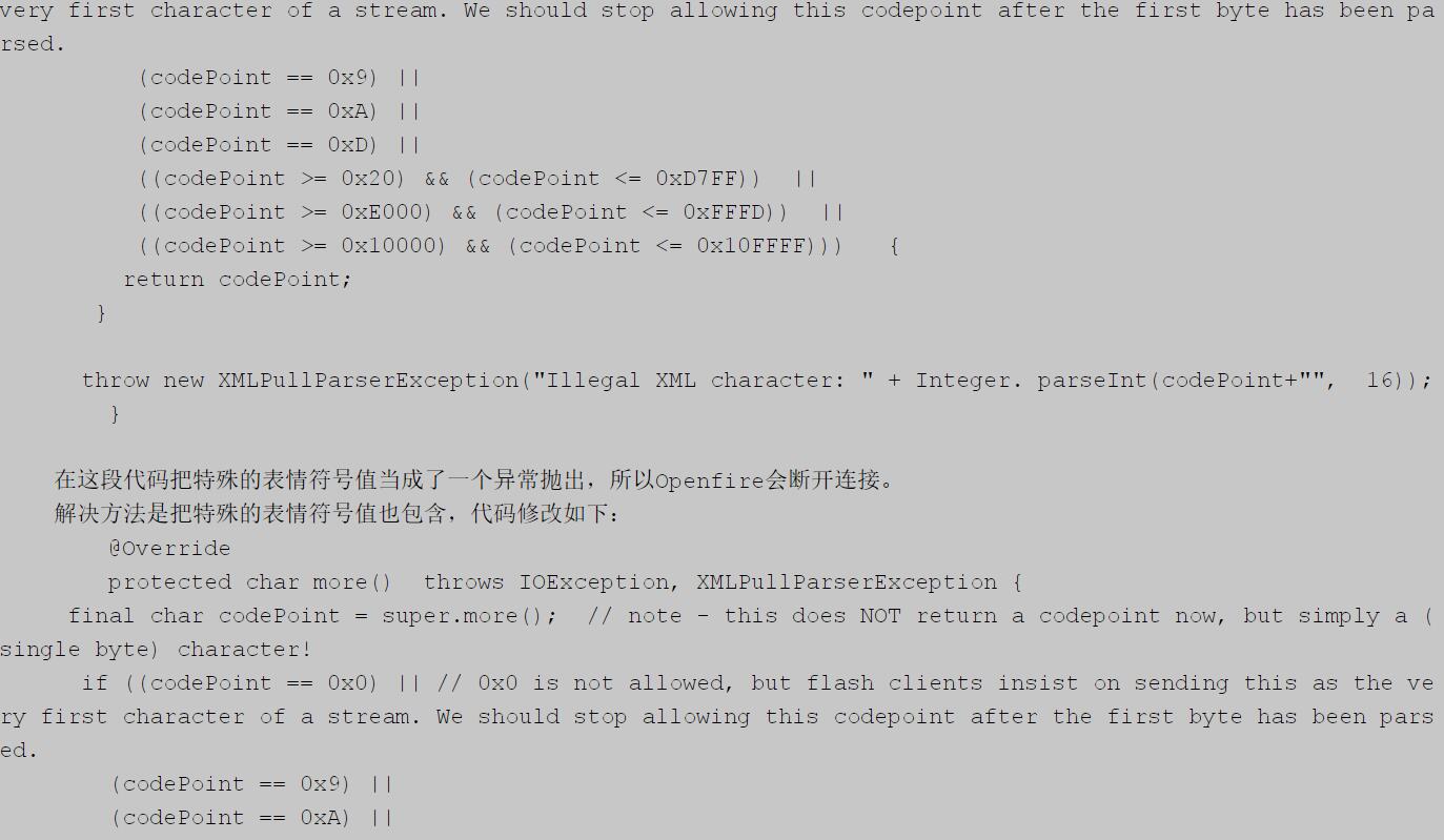 3.APP開(kāi)發(fā)處理表情方法4.3 0penfire中發(fā)送表情引起連接斷開(kāi)的問(wèn)題,Openfire中如果客戶(hù)端發(fā)送某些特殊的字符(例如些表情符號(hào)).xmpp會(huì)斷開(kāi)客戶(hù)端的連接,經(jīng)查這個(gè)問(wèn)題是由Openfire的以下代碼引起的。