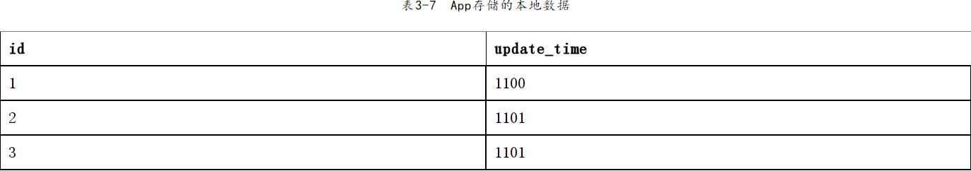 這里是重點(diǎn)⑤:API中返回id為6的數(shù)據(jù)已經(jīng)在App的本地?cái)?shù)據(jù)存在,對于這條數(shù)據(jù),App端應(yīng)該放棄重復(fù)插入。最后App存儲的本地?cái)?shù)據(jù)如表3-7表示。