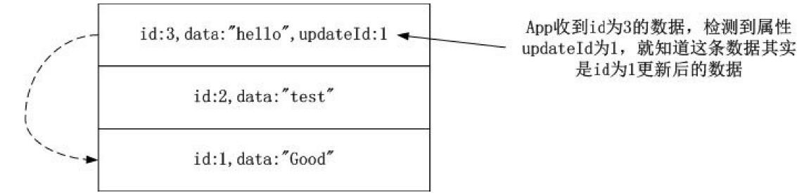 但是使用了id作為更新的標(biāo)準(zhǔn),在數(shù)據(jù)庫上獲取更新的數(shù)據(jù)電成了個(gè)問題:更新數(shù)據(jù)只更改數(shù)據(jù)的其他內(nèi)容,不會更改數(shù)據(jù)的id值。一個(gè)解決方法是把更新數(shù)據(jù)變成插入條新數(shù)據(jù),在插入的數(shù)據(jù)中設(shè)置屬性“updateld”指向需要更新的數(shù)據(jù),App收到這條數(shù)據(jù)后檢查到這個(gè)屬性就知道其是更新舊數(shù)據(jù),如圖3-10所示。