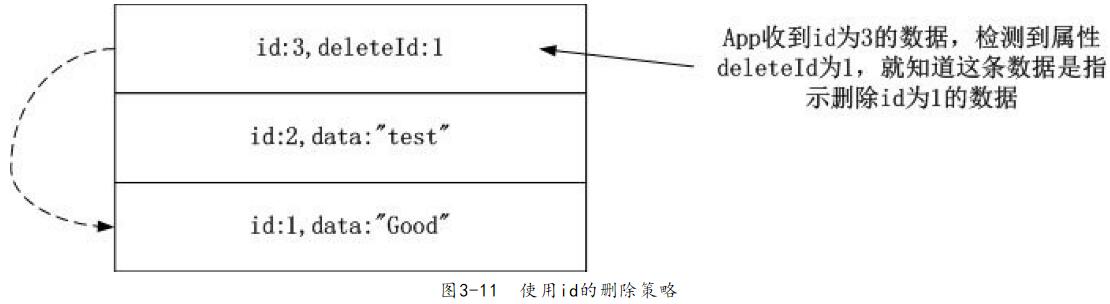 刪除的策略也是和更新數(shù)據(jù)類似的策略:插入條數(shù)據(jù),在插入的數(shù)據(jù)中設(shè)置屬性“deleteld”指向原來的數(shù)據(jù).App收到這條數(shù)據(jù)后檢查到該屬性就知道其是刪除舊數(shù)據(jù),如圖3-11所示。