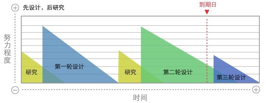圖4描述的是錯(cuò)誤的設(shè)計(jì)過程,在設(shè)計(jì)前未進(jìn)行充分研究,導(dǎo)致項(xiàng)目延期。這是深圳APP開發(fā)公司開發(fā)者的個(gè)人經(jīng)驗(yàn)總結(jié),客戶(投資人、老板)通常都不能一次性把功能和需求考慮周全,所以在第一個(gè)設(shè)計(jì)周期時(shí)可以進(jìn)行適當(dāng)?shù)木彌_。向他們?cè)儐栆恍┍匾膯栴},而且在這個(gè)環(huán)節(jié)他們通常也會(huì)給出更多細(xì)節(jié)。如果看不到第一回合(階段)的設(shè)計(jì),他們很難回答我們提出的問題。一旦他們看到第一階段設(shè)計(jì)草圖或者線框圖,他們就會(huì)變成信息的源泉。在設(shè)計(jì)之初,有依據(jù)的步步推進(jìn)是符合設(shè)計(jì)邏輯的,完全勝過空洞的想象和抽象的描述。