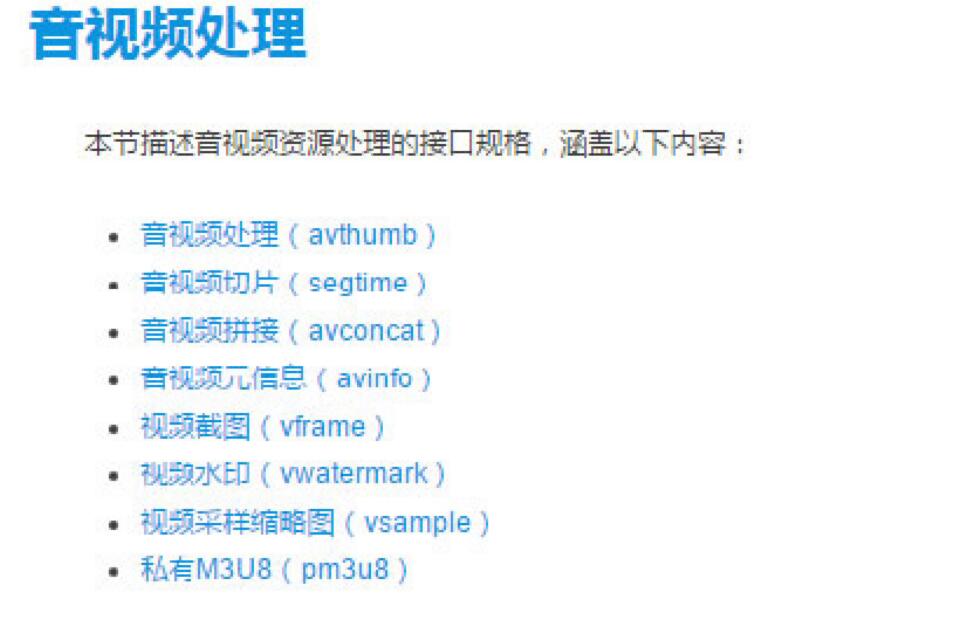 從上圖可看到FFmpeg占用了差不多90%的CPU資源。App后臺要快速處理視頻就需要高性能的服務(wù)器集群,但是對于創(chuàng)業(yè)型公司來說,在服務(wù)器這方面的開支是非常不合算的。因此創(chuàng)業(yè)型公司可充分運用云服務(wù),例如七牛提供的服務(wù)就包含音/視頻格式的轉(zhuǎn)換,調(diào)用非常方便,如圖3 13所示。