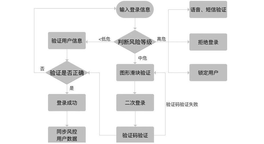如圖4-23所示,將用戶的登錄信息輸入風控系統(tǒng)進行規(guī)則判斷,如果判定為高危,則需要升級登錄驗證等級,使用語音或短信方式驗證;而如果用戶是被風控標記的用戶,則拒絕用戶登錄,出現(xiàn)過異常登錄行為的用戶則會被凍結(jié)用戶資產(chǎn),被凍結(jié)的用戶必須經(jīng)過線下人工核實后方可以解凍。圖4-23風控評定等級為中等危險,則需要提示用戶通過滑塊或圖形驗證碼進行二次登錄。中等危險的登錄評定不會強制打斷登錄過程,而是增加二次驗證以確保用戶身份。驗證通過后,系統(tǒng)根據(jù)用戶輸入的信息進行用戶登錄信息的核準,如用戶登錄信息輸入無誤則會完成登錄,輸入錯誤則會返回登錄界面。所有的登錄信息,無論成功還是失敗,都需要將登錄行為數(shù)據(jù)同步到風控系統(tǒng),用于后續(xù)的行為分析評估。如果風控系統(tǒng)評估等級為低危以下,則按照正常的登錄流程進行登錄驗證。[聲明]本網(wǎng)轉(zhuǎn)載網(wǎng)絡媒體稿件是為了傳播更多的信息,此類稿件不代表本網(wǎng)觀點,本網(wǎng)不承擔此類稿件侵權(quán)行為的連帶責任。故此,如果您發(fā)現(xiàn)本網(wǎng)站的內(nèi)容侵犯了您的版權(quán),請您的相關(guān)內(nèi)容發(fā)至此郵箱【qin@198bona.com 】,我們在確認后,會立即刪除,保證您的版權(quán)。