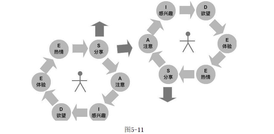 APP開發(fā)公司框架規(guī)劃工程師將消費(fèi)者在CGM環(huán)境下的心理發(fā)展分為注意(Attention)、感興趣(Interest)、欲望(Desire)、體驗(yàn)(Experience)、熱情(Enthusiasm)和分享(Share)6個(gè)階段,這6個(gè)階段的英文名稱第一個(gè)字母的組合即是“AIDEES”。AIDEES模型是由日本的片平秀貴提出的,AIDEES模型強(qiáng)調(diào)信息在流轉(zhuǎn)過程中進(jìn)行的動(dòng)態(tài)轉(zhuǎn)化,用戶對(duì)每個(gè)產(chǎn)品關(guān)注、傳播的過程都可以成為另一個(gè)產(chǎn)品的轉(zhuǎn)化源頭。這個(gè)模型特別適用于現(xiàn)在APP開發(fā)移動(dòng)互聯(lián)網(wǎng)時(shí)代的傳播路徑,也就是現(xiàn)在比較流行的社交電商,如圖5-11所示。在社交電商中,用戶的接觸點(diǎn)不再是單一維度,更多的傳播來源于用戶群體本身。結(jié)合群體的特征來分析提供引起用戶關(guān)注(Attention)的產(chǎn)品是營(yíng)銷方案和營(yíng)銷渠道需要注意的關(guān)注點(diǎn)。CRM設(shè)計(jì)中也需要考慮用戶在不同環(huán)節(jié)需要切入的接觸點(diǎn)以及如何根據(jù)群體特征引發(fā)用戶的傳播(即分享)