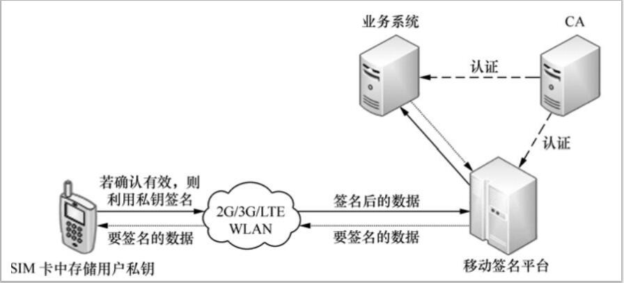 可以看出,電子簽名方式為最安全的確認方式,但由于該方式實現時的一份數字證書僅適用于一項應用,不具備普遍適用性,一定程度上阻礙了電子簽名技術的發(fā)展。相比之下,移動簽名的使用較好地解決了適用性的問題,能夠“一證多用”。同時,普通簽名技術的實現需依靠業(yè)務終端,要簽名的數據信息在傳送至簽名服務器前必須先傳給業(yè)務終端,之后由業(yè)務終端轉發(fā)給簽名服務器。該方式無法滿足不同種類移動終端的業(yè)務需求,因為簽名服務器無法實現和業(yè)務終端較好地適配,故傳統數字簽名技術僅針對部分設備適用。移動簽名技術針對上述問題轉換思路,總體實現思路是:私鑰存儲于移動終端的SIM卡中,業(yè)務系統先將需要簽名的交易數據信息發(fā)送至移動簽名平臺,再由移動簽名平臺將數據信息發(fā)送至用戶的移動終端,之后,用戶將移動終端顯示的數據信息和業(yè)務終端上的數據信息進行比對,若二者一致,則在移動終端上進行確認,利用私鑰對數據信息進行簽名。簽名后的內容經移動簽名平臺傳送到業(yè)務系統,業(yè)務系統對簽名的有效性進行驗證,若驗證通過,表明用戶對本次交易信息認可,可進行后續(xù)操作??傮w而言,移動簽名本質上是數字簽名技術的應用,數字簽名功能具體由移動設備完成[。移動簽名技術原理如圖3-8所示。