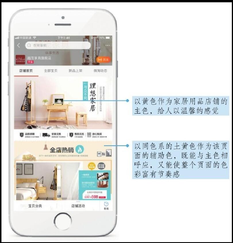 選擇同類(lèi)色的顏色搭配,并不表示顏色毫無(wú)變化,可以通過(guò)調(diào)整色彩的透明度和飽和度使單一色彩深淺有別。某店鋪的主色(即在頁(yè)面中占據(jù)面積最大、具有主導(dǎo)作用的色彩)是黃色,輔助色為土黃色,整個(gè)頁(yè)面看起來(lái)色彩統(tǒng)一,又有層次感,如圖2-3所示
