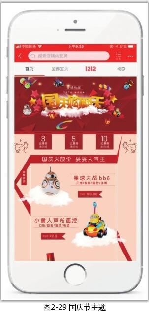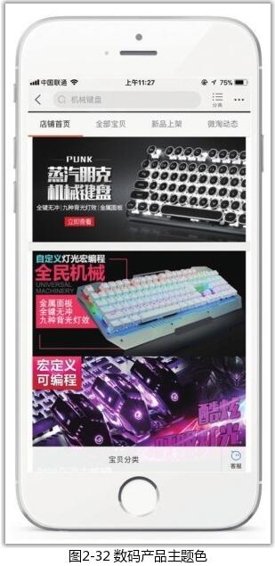 人們對于一個店鋪色彩的記憶往往更傾向于其包裝,包裝本身也代表著整個店鋪的風格定位。色彩有著自己的語言,可以喚起人們的心靈感知,所以在確定移動端店鋪主題色調(diào)時,應該注意與商品特性相符合,或與目標消費群體的特性相符合。如果店鋪主營18~30歲的女性時尚服飾,那么比較適合的主題色就是偏粉色、紅色的柔和浪漫色系,如圖2-31所示;如果店鋪主營手機、相機等數(shù)碼類產(chǎn)品,那么藍色、黑色和灰色系往往會給消費者以理智、高貴、沉穩(wěn)的感覺,如圖2-32所示。
