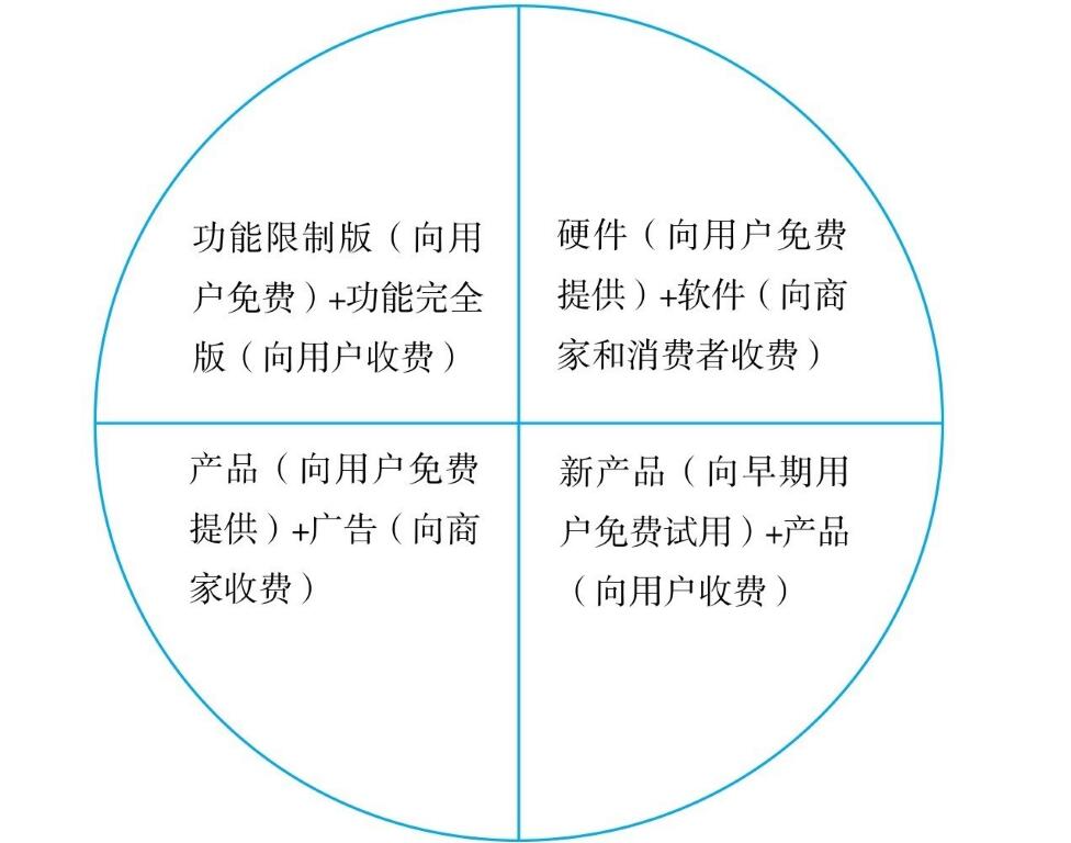由此可以看出.免費(fèi)模式的本質(zhì)并不是免費(fèi),而是交叉補(bǔ)貼,即A免費(fèi),由B補(bǔ)貼A.這只是種替代模式,在這個基礎(chǔ)上,免費(fèi)模式可繼續(xù)細(xì)分為4種,如圖6-1所示。