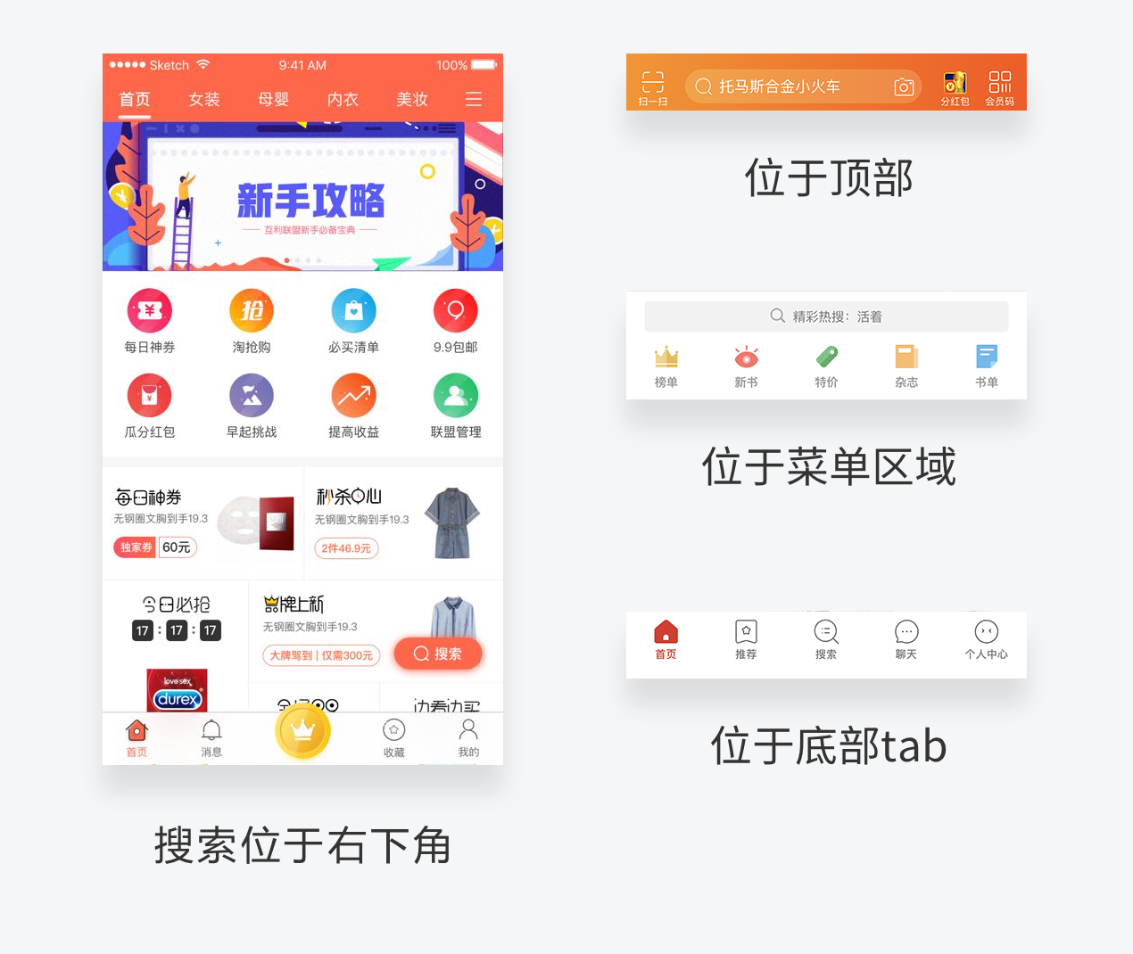 這位設計師把搜索的功能入口放置在了右下角,其理由是:對比其他購物app的搜索位置,方便于用戶單手點擊操作。
