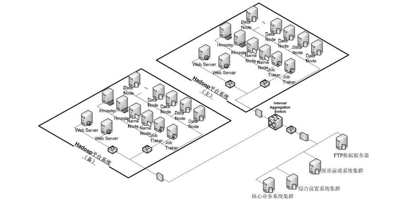 主要功能是為系統(tǒng)提供加工處理的源數(shù)據(jù)。在金融銀行業(yè)中,這些源數(shù)據(jù)是他們的核心業(yè)務(wù)數(shù)據(jù)。接口模塊主要功能是針對(duì)不同的數(shù)據(jù)源和數(shù)據(jù)格式,提供對(duì)應(yīng)的數(shù)據(jù)導(dǎo)入處理方法。功能應(yīng)用模塊主要功能是根據(jù)業(yè)務(wù)處理需要和系統(tǒng)運(yùn)行需要提供對(duì)應(yīng)的功能處理模塊,功能應(yīng)用模塊中包含數(shù)據(jù)挖掘算法、業(yè)務(wù)處理流程等。數(shù)據(jù)模塊主要功能是提供HBase數(shù)據(jù)庫,對(duì)非結(jié)構(gòu)化數(shù)據(jù)進(jìn)行統(tǒng)一存放管理,提供HDFS文件系統(tǒng),提供數(shù)據(jù)多副本備份存儲(chǔ)管理。展示模塊對(duì)處理后的結(jié)果進(jìn)行Web頁面展示,同時(shí)還要根據(jù)原有系統(tǒng)的需求,提供不同的數(shù)據(jù)展示處理方式。金融銀行業(yè)對(duì)數(shù)據(jù)存儲(chǔ)安全要求非常高,因此系統(tǒng)必須設(shè)計(jì)異地容災(zāi)備份存儲(chǔ)。應(yīng)將分布式系統(tǒng)基礎(chǔ)架構(gòu)平臺(tái)系統(tǒng)軟件在不同的機(jī)房集群中進(jìn)行部署,系統(tǒng)采用主備集群的模式進(jìn)行部署,通常采用的物理部署結(jié)構(gòu)如下圖所示。