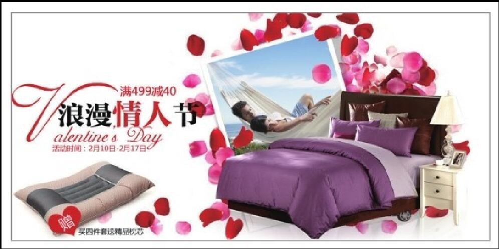 網(wǎng)站建設公司在設計制作時會從移動電商中信息的傳播不同于紙質媒體來布局,因為電商平臺避開了打印、審批、復印與發(fā)行等一系列復雜的實現(xiàn)與傳達過程,具有更迭速度快的特點,而這一特點也使移動電商的視覺設計有了“犧牲”的條件。深圳網(wǎng)站建設公司以某家紡品牌為某款床上四件套商品所制作的廣告圖片如圖4-5所示。不難發(fā)現(xiàn),該圖片以“情人節(jié)”為主題,向消費者傳遞了節(jié)日的氣氛,其中包含的情感能在一定程度上打動消費者的心,從而促成其購買,同時這其實也是一種“犧牲”。